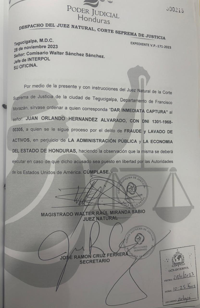 Johel Zelaya, el fiscal general de Honduras, publicó una foto del documento que ordena la captura de Hernández. Foto: Johel Antonio Zelaya Alvarez/X