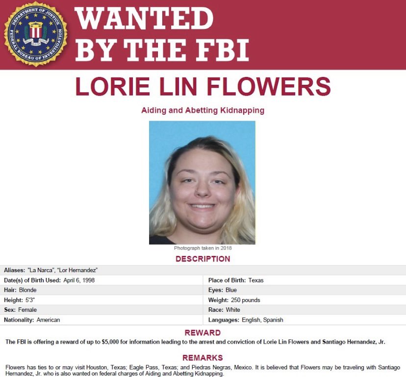 El FBI ofrece $5,000 dólares de recompensa a quien proporcione información que ayude al arresto de Lorie Lin Flowers alias “La Narca” y de Santiago Hernández Jr. alias “Flako”, “Black” o “Jay”.