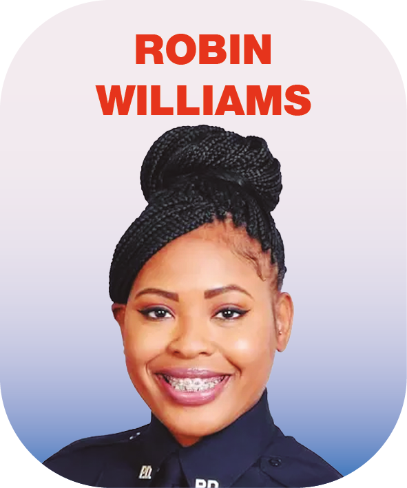 Robin Williams es oficial de policía y estuvo en la marina, es una graduada universitaria, obtuvo una maestría en Gestión Penal y Administración de Justicia. Sirvió en el Cuerpo de Marines de EE.UU. en servicio activo de 2011 a 2015.