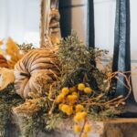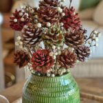 Recolecte adornos gratuitos como calabazas pequeñas, piñas y flores y follajes otoñales para crear un centro de mesa natural. Combínelos con frascos de vidrio, jarrones y otros objetos vintage de metal o cerámica que ya tenga en casa para lograr una composición ecléctica.