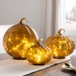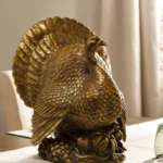 Las calabazas de cristal iluminadas aportan un toque de lujo rústico. Una escultura decorativa de un pavo dorado preside una mesa de comedor, exhibiendo plumas detalladas y una base texturizada, realzando un ambiente festivo.
